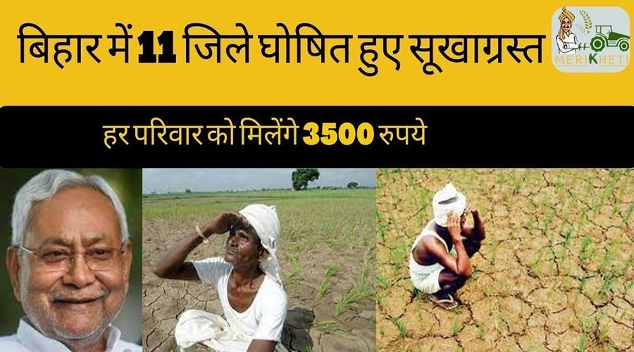 इस साल कई राज्यों में मानसून की बेरुखी देखने को मिली है, जिसके कारण राज्यों के कई जिलों में सामान्य से कम बरसात दर्ज की गई। इसका असर यह हुआ है कि राज्य में सूखे जैसे हालत बन गए हैं और कई किसानों की खेत में खड़ी फसलें तबाह हो गईं हैं। कुछ इस प्रकार का दृश्य बिहार में ज्यादा देखने को मिल रहा है। बिहार में इस साल लगभग 11 जिलों में सामान्य से कम बरसात हुई है, जिसके कारण खरीफ की फसलें सूख गईं हैं और उत्पादन में पिछले साल की अपेक्षा लगभग 70 प्रतिशत की कमी दर्ज की गई है। इस बार कम बरसात की वजह से बिहार के कई जिलों में धान रोपाई का रकबा भी घटा है, जिसका सीधा असर धान के उत्पादन पर पड़ा है। इन सभी घटनाक्रमों को देखते हुए राज्य के मुख्यमंत्री नीतीश कुमार ने अपनी अध्यक्षता में कैबिनेट की एक मीटिंग बुलाई और राज्य के 11 जिलों को सूखाग्रस्त घोषित कर दिया है। इसके साथ ही मुख्यमंत्री नीतीश कुमार ने ऐलान किया है कि सूखाग्रस्त गांवों में रहने वाले प्रत्येक परिवार को बिहार सरकार सहायता राशि के तौर पर 3500 रूपये का अनुदान प्रदान करेगी। यह अनुदान राशि सरकार के द्वारा सीधे किसानों के बैंक खातों में भेजी जाएगी।