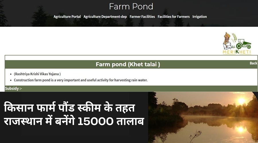 किसान फार्म पौंड स्कीम (Farm pond (Khet talai )) निकाली है. इस योजना के तहत जो भी किसान इस योजना के लिए आवेदन करेगा तो उसके खेतो में पानी इकट्ठा करने के लिए तालाब बनवाना होगा. जिससे जब भी बारिश होगी तो उस तालाब में पानी इकट्ठा हो जाएगा जिसे किसान बाद में अपने खेतो की सिंचाई के लिए इस्तमाल कर सकता है. इस स्कीम की मदद से किसानो की फसल का नुकसान नहीं होगा. यह स्कीम किसानों के लिए बहुत मददगार साबित होगी.